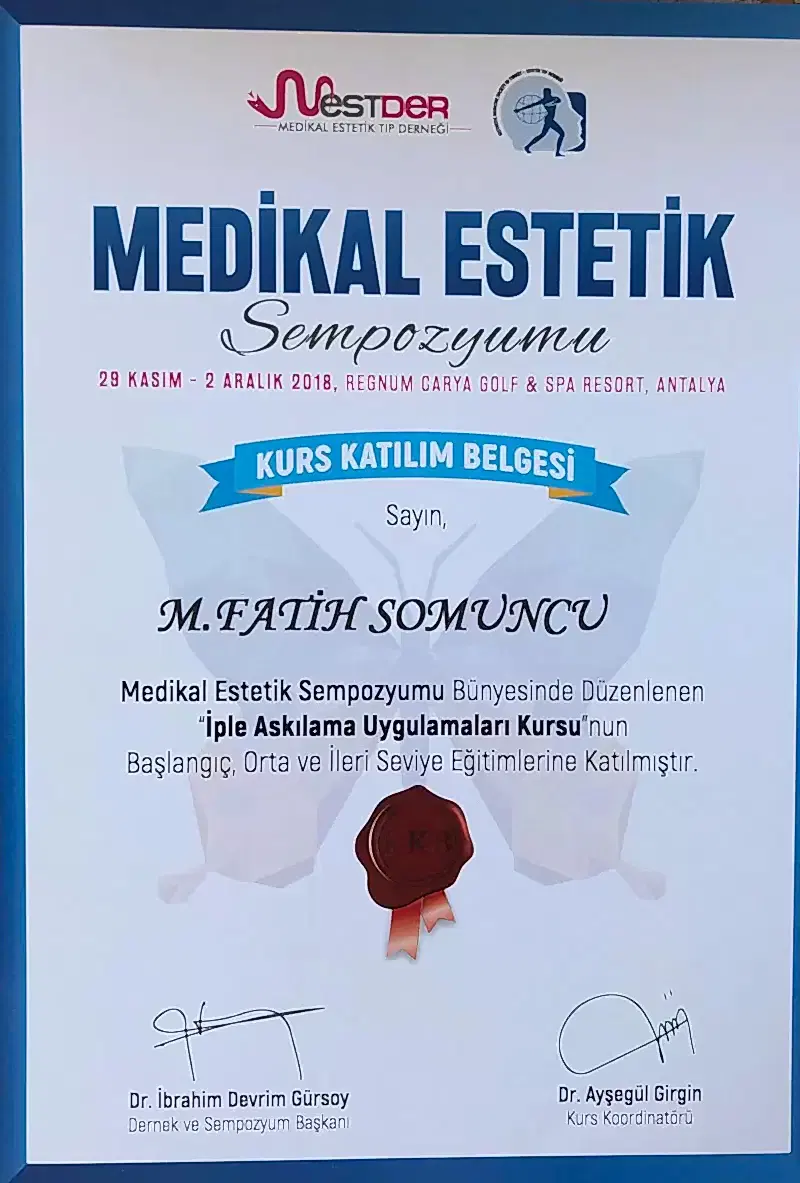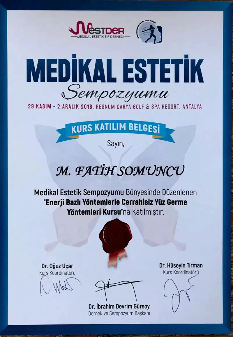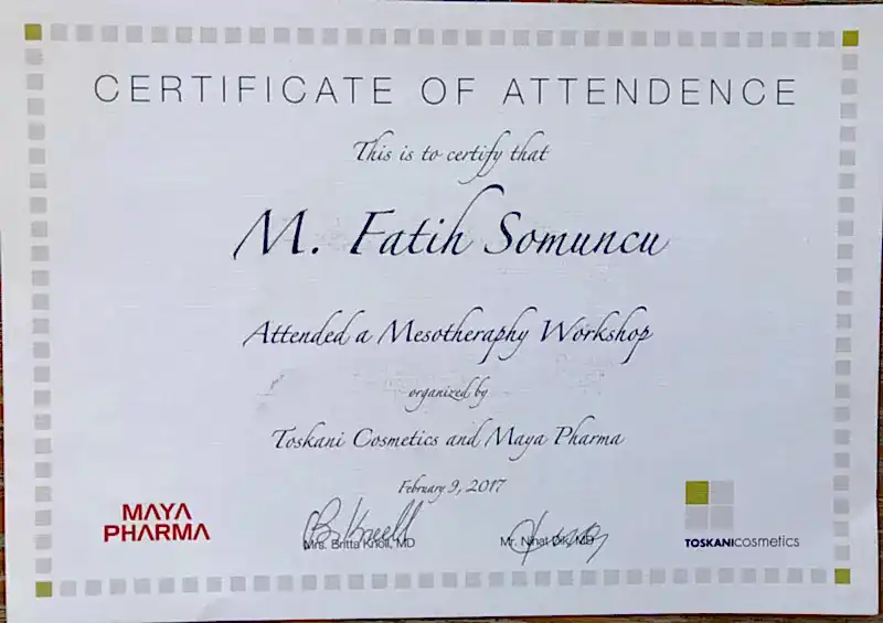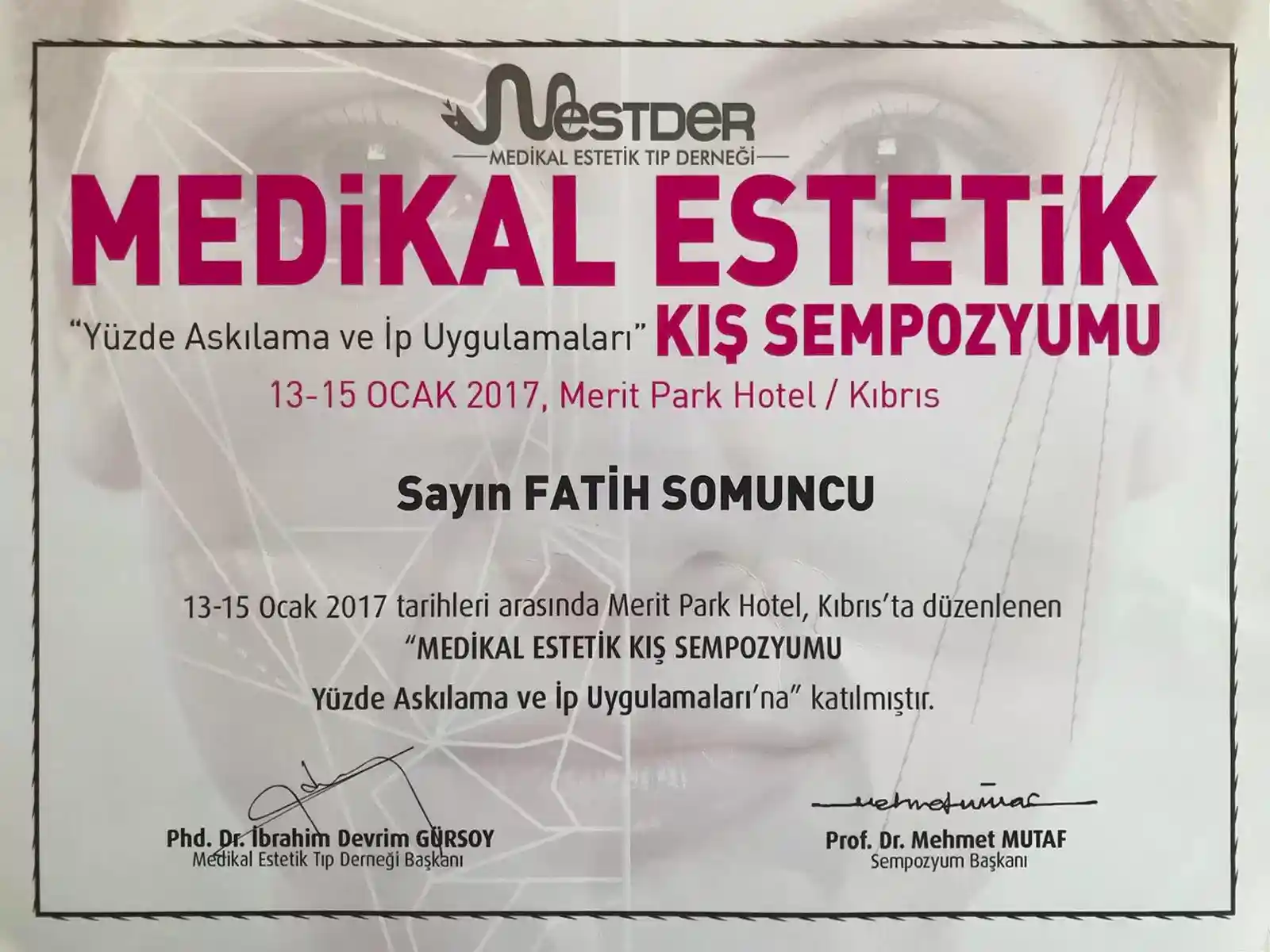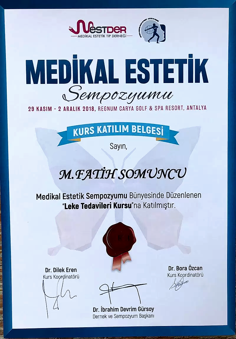 Sağlık Bakanlığı tarafından düzenlenen ‘Estetik ve Kozmetik Uygulamaları’ sertifikasyon eğitimini gerek teorik gerekse pratik bölümlerinden ‘tam puan’ alıp üstün başarı ile bitirip sertifika almaya hak kazanmıştır.